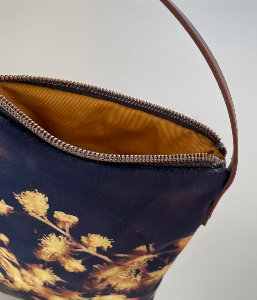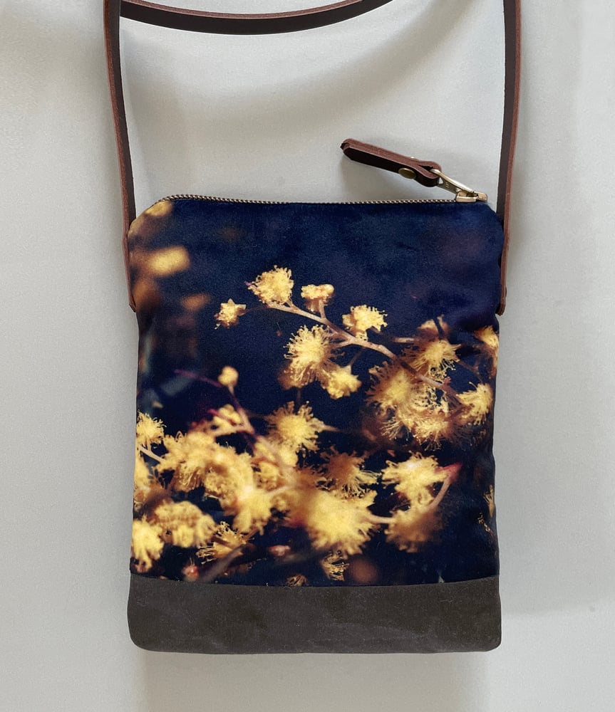 Acacia blossom features on this velvet and waxed canvas crossbody shoulder bag. Sturdily handmade, water resistant for everyday wear and slimline style to fit a phone.