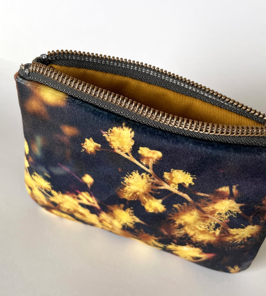 Bright acacia blossoms feature on both sides of this mini velvet zipper purse. Lined with cotton and large enough to fit credit cards/jewellery.