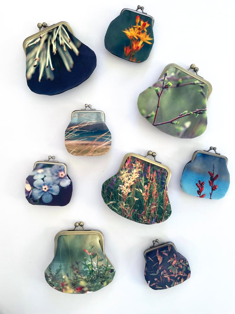 This velvet coin purse features a striking yellow bog asphodel flower on both sides. Printed velvet outer topped with a brass kisslock frame. This coin purse fits credit cards vertically.
