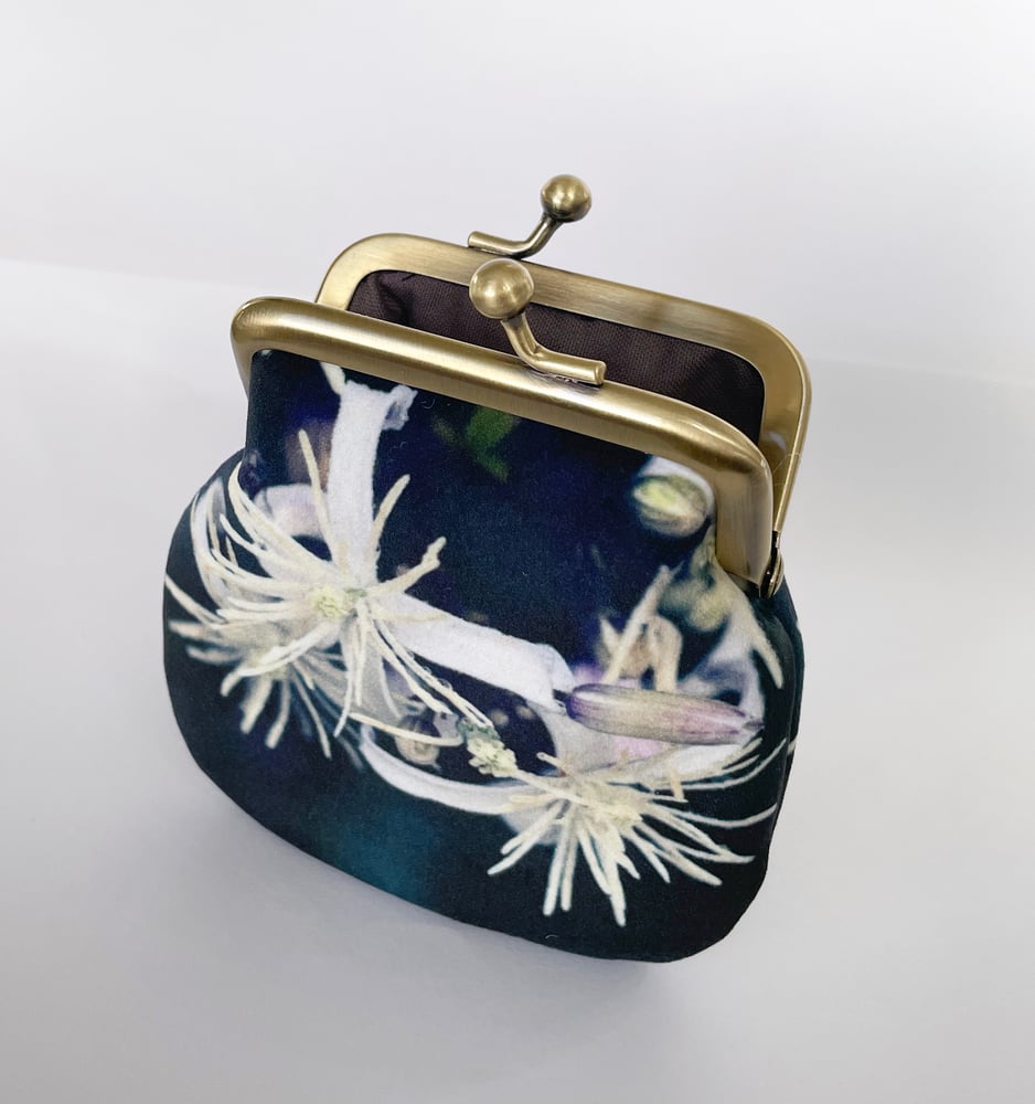Starry clematis flowers feature on both sides of this kisslock purse. Perfect for carrying small treasures such as jewellery, ear buds, keys etc. Also fits cards vertically.