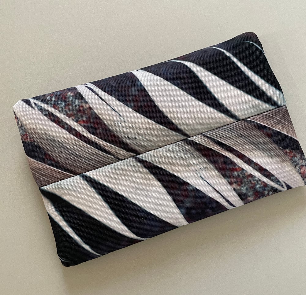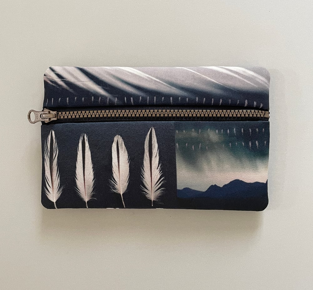 Oystercatcher feathers and a mountain silhouette features on this original zipper purse. A roomy size that fits a phone and is handy for carrying everyday treasures.