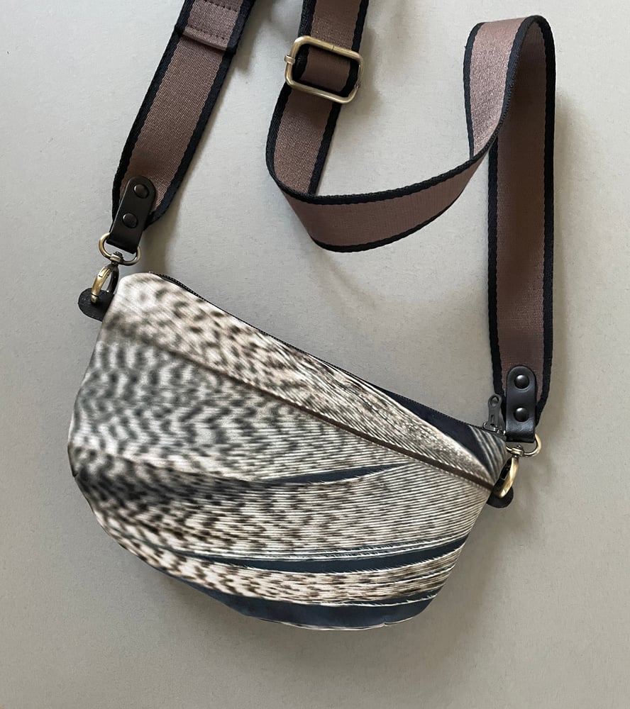 This velvety crossbody shoulder bag has a luxe finish with the detail of a mallard feather print on both sides and is sturdily handmade for everyday wear.