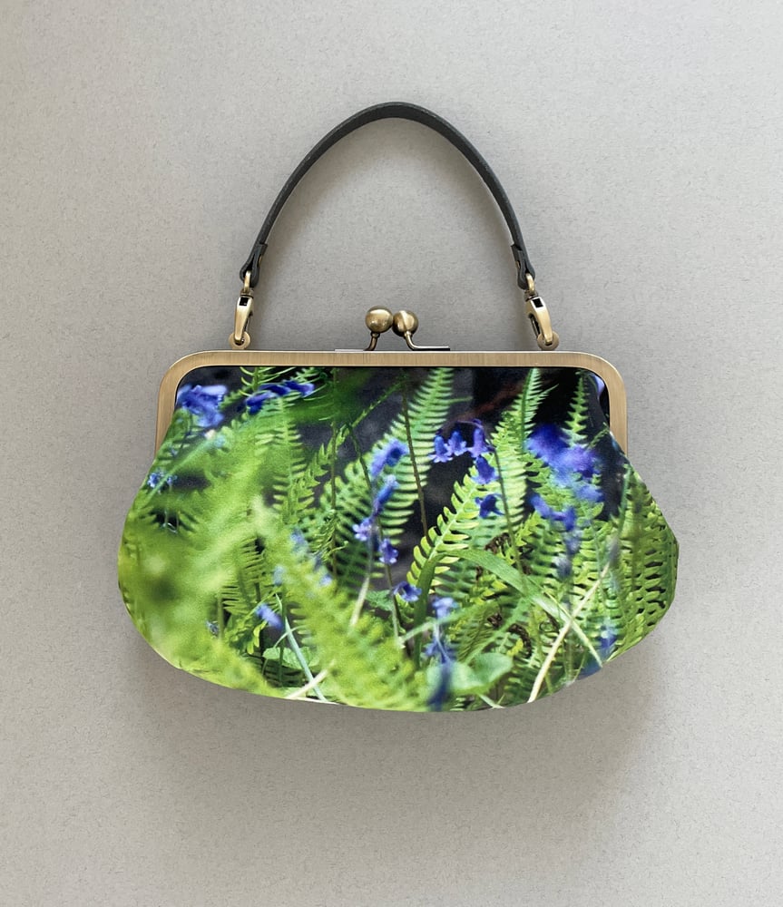 Fern and bluebells, velvet clutch bag with optional strap