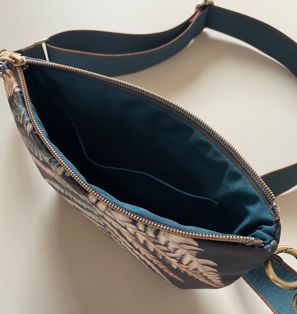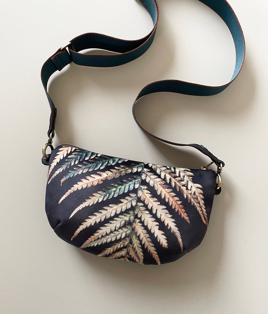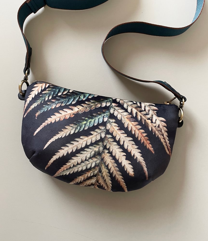 This velvety crossbody shoulder bag has a luxe finish with a fern frond print on both sides and is sturdily handmade for everyday wear.