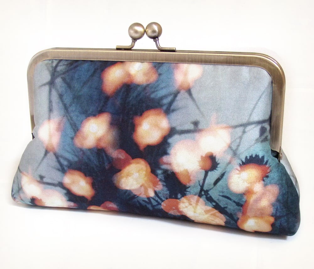 Orange sparkling lights in the blue forest, an original printed silk clutch bag. The purse is topped with an antiqued brass frame and chain handle and lined in blue dupion silk. Arrives in a quality keepsake Red Ruby Rose gift box, making it perfect for gift-giving or keeping.