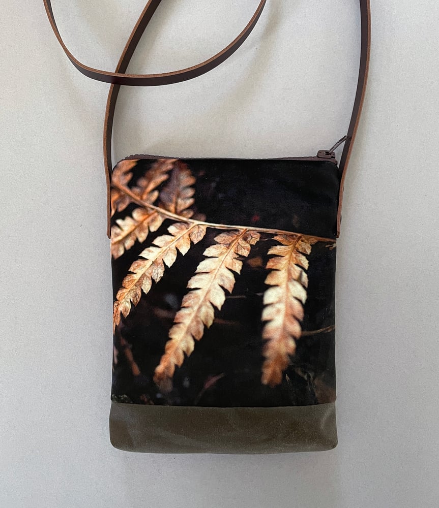 Golden fern frond, crossbody velvet and waxed canvas phone bag