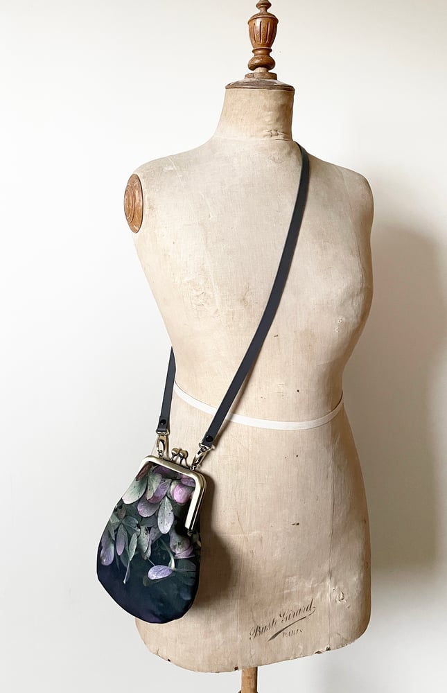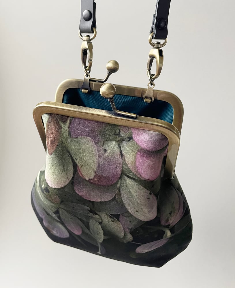 Delicate hydrangea petals feature on both sides of this velvety shoulder bag. Lined with cotton and topped with a brass frame. Roomy enough for phone, keys and other everyday treasures.