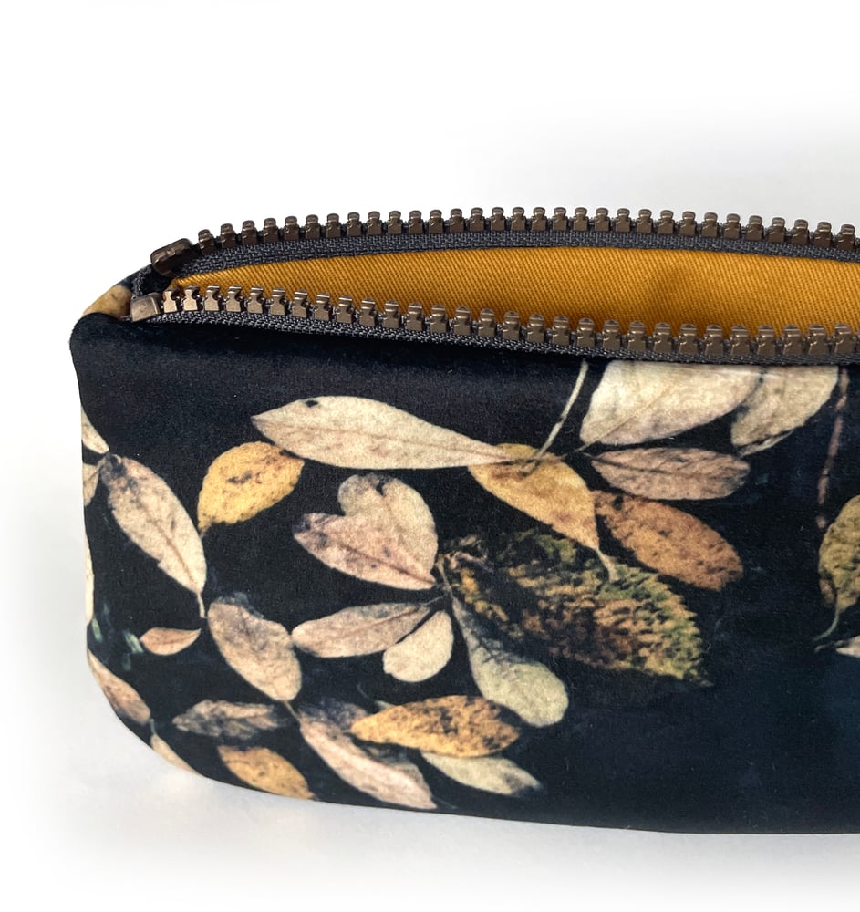 Leaves silhouetted on a loch feature on both sides of this original printed velvet zipper purse. Lined with cotton and large enough for coins, cards, glasses, keys - those smaller everyday treasures.
