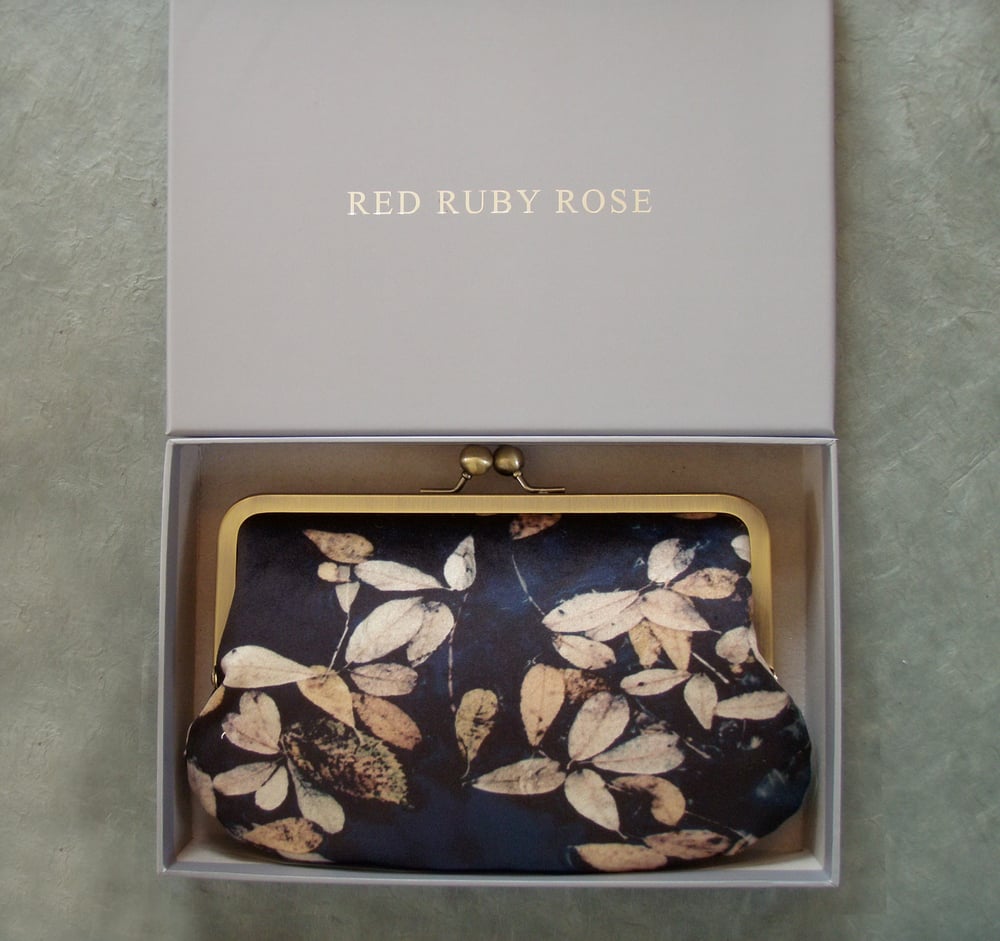This printed velvet shoulder bag features silhouetted leaves on a loch. The bag is topped with a brass kisslock frame and will hold essentials and treasures including phone, keys and wallet and arrives in a keepsake Red Ruby Rose gift box.