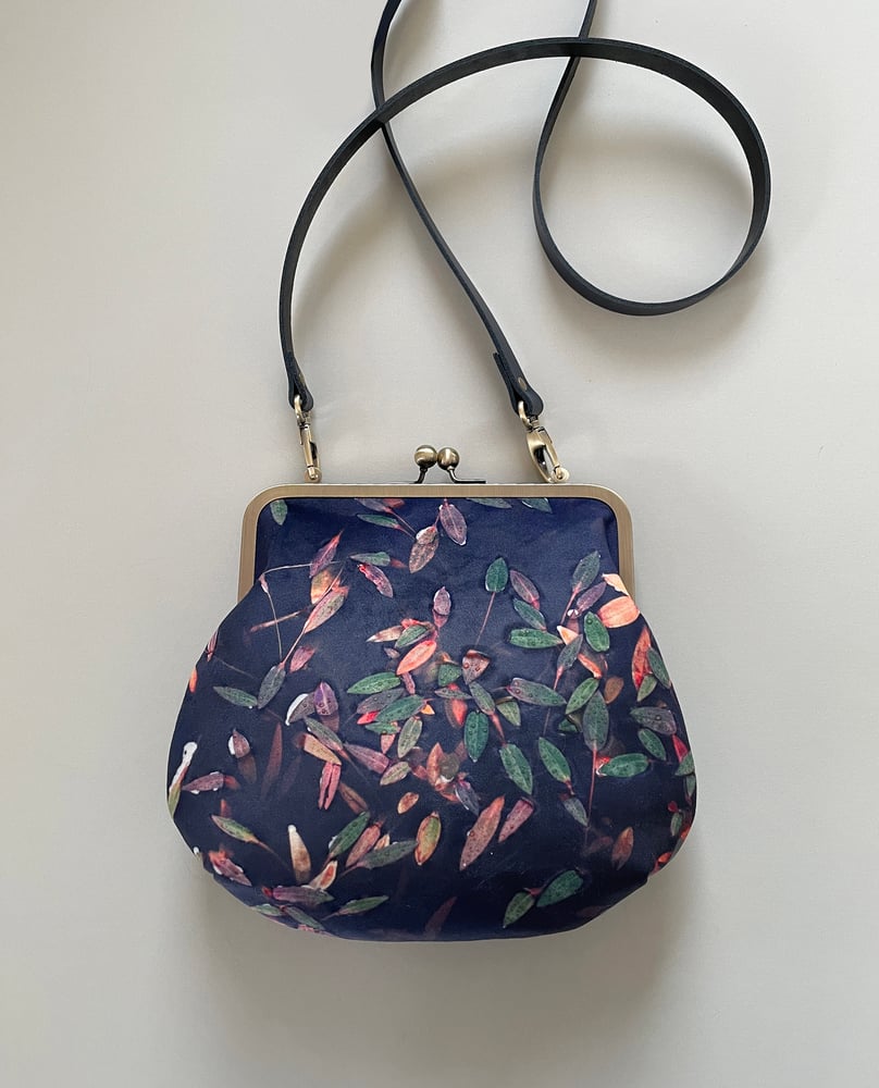 Colourful leaves on a lochan feature on both sides of this large velvety kisslock bag. Lined with cotton and topped with a brass frame. Roomy enough for lots of everyday treasures including phone, larger wallet, keys, book/kindle. strap is removable and frame loops drop down into bag when not in use.