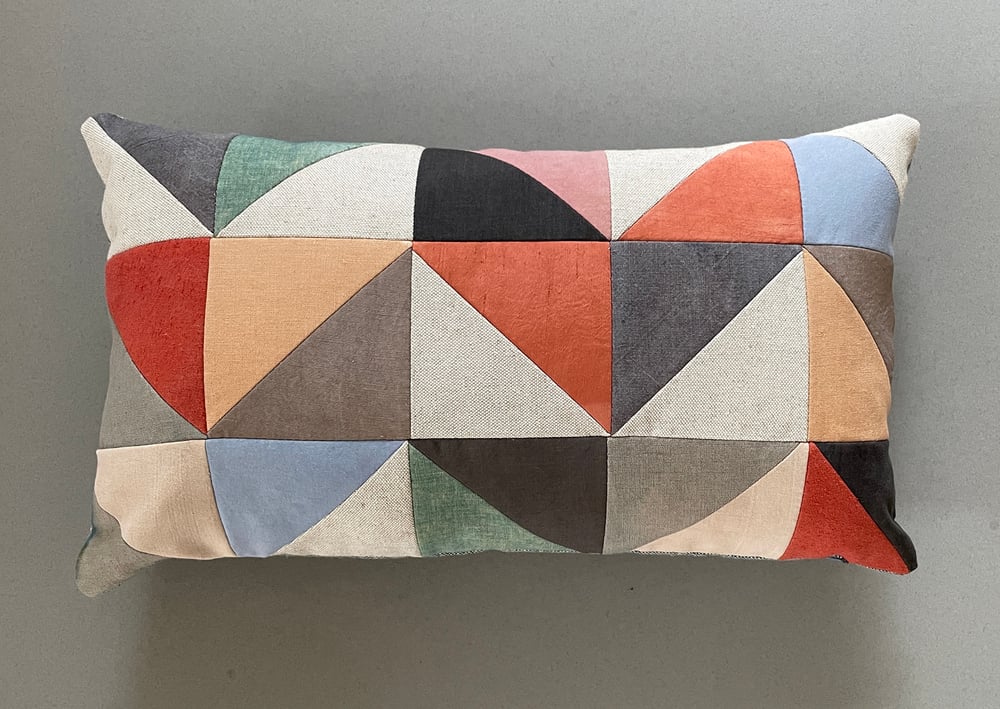 A colourful plant-dyed patchwork features on this one-off cushion. Dyed panels include indigo, madder, walnut, heather, oak gall, and meadowsweet on linen, silk and cotton. Invisible zipper along base, with poly-fibre cushion and 100% Irish linen back.