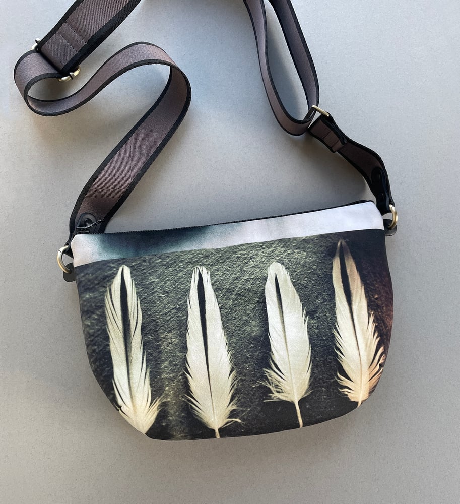 This velvety crossbody shoulder bag has a luxe but hardwearing finish with a slightly different oystercatcher feathers print on each side. Sturdily handmade for everyday wear.