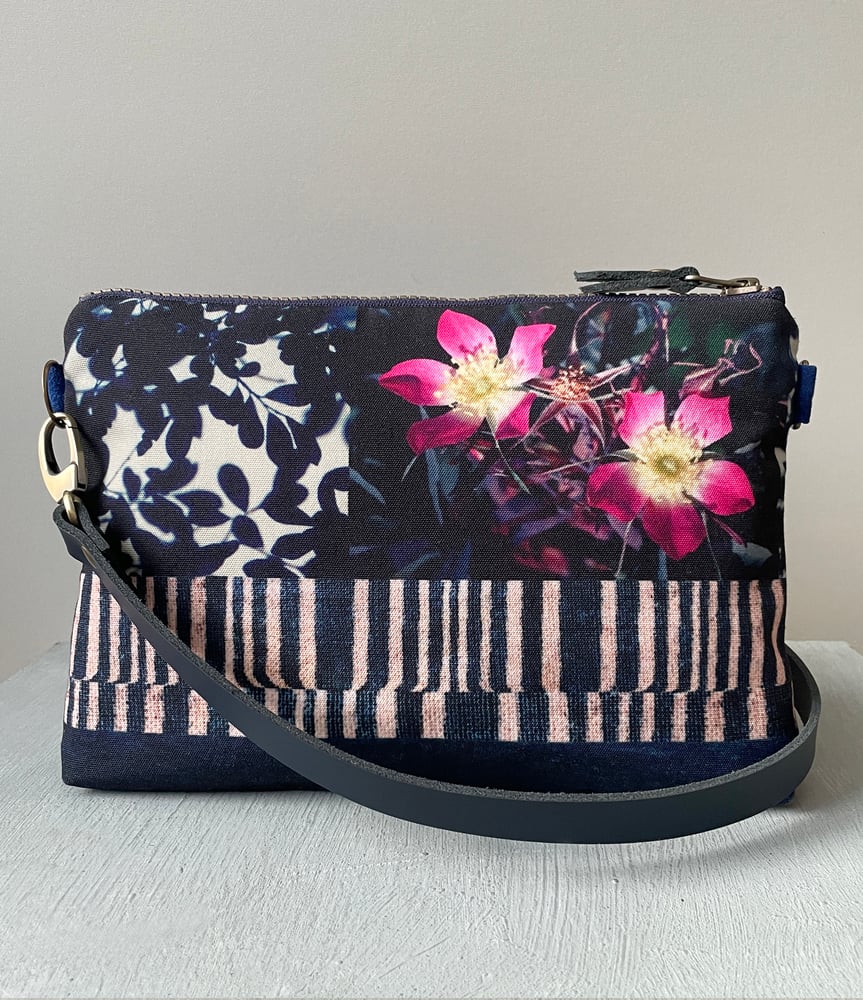 Rosa, a spacious crossbody canvas shoulder bag inspired by the natural landscapes of Scotland's west coast. Featuring wild roses and willow leaf silhouettes on both sides, printed onto canvas.
