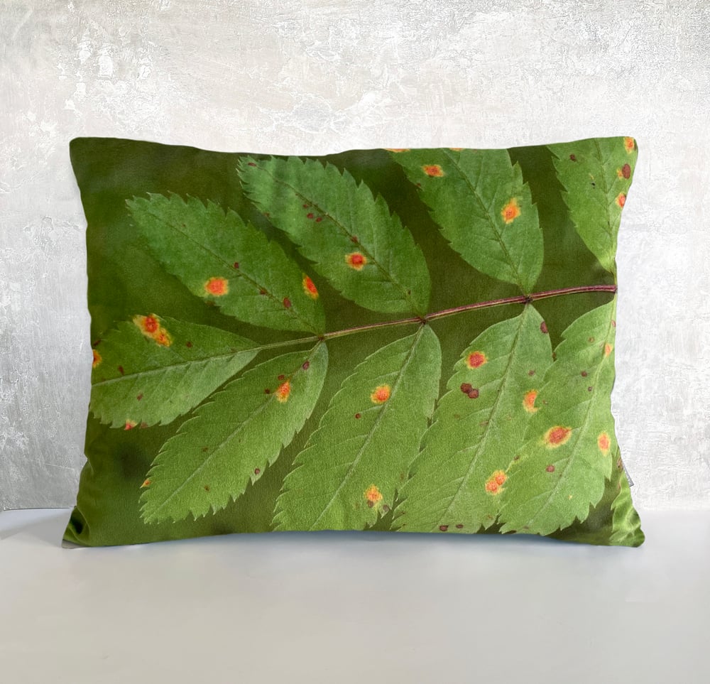 This luxury printed velvet cushion features a rowan leaf detail detail.