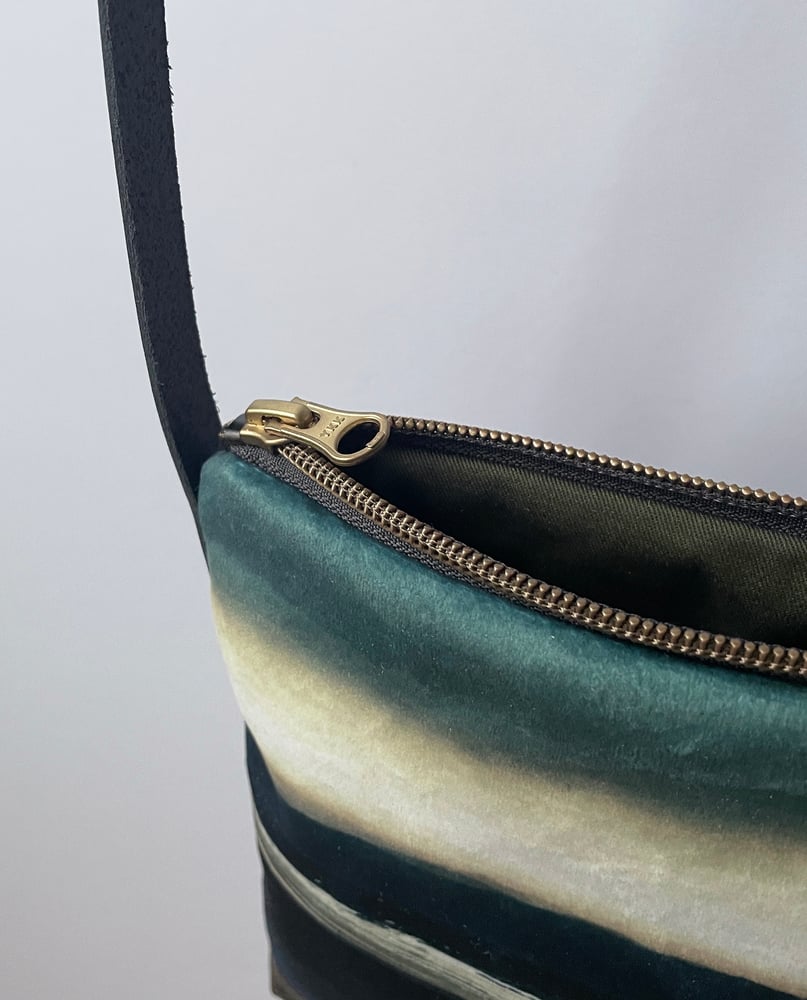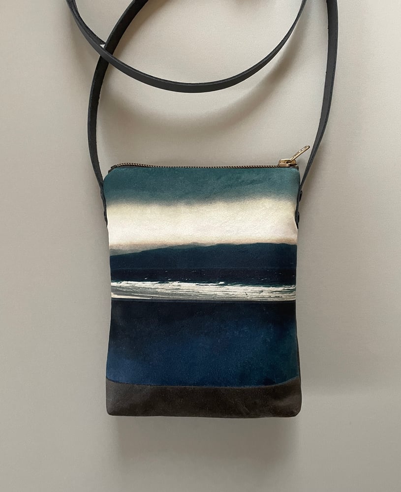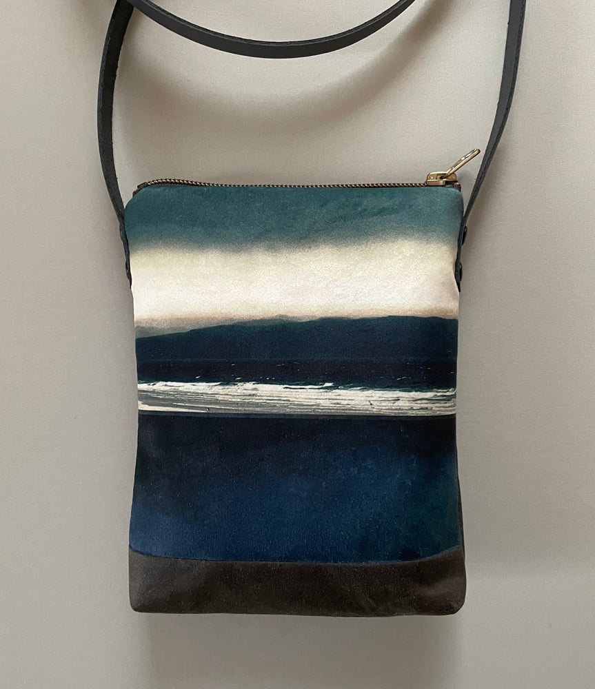 A seascape scene features on this velvet and waxed canvas crossbody shoulder bag. Sturdily handmade, water resistant for everyday wear and slimline style to fit a phone.