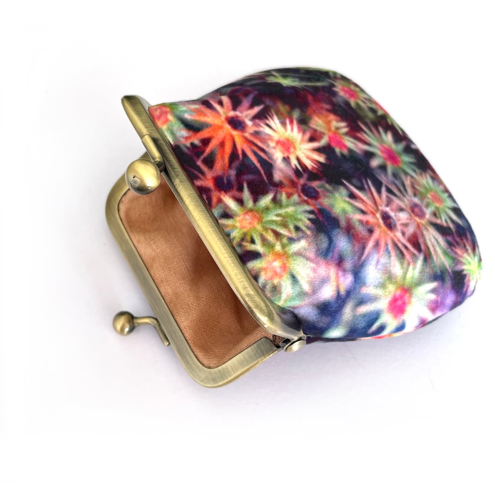 Starry mosses feature on both sides of this velvet coin purse, topped with a brass kisslock frame. Perfect for carrying small treasures such as jewellery, ear buds, keys etc.
