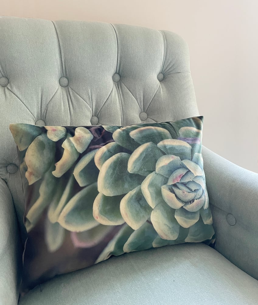>> About this cushion. Inspired by seasonal natural landscapes, flora and fauna, these succulent leaves were photographed at Inverewe garden. Fabric printed in the UK and constructed and handmade by Rowena in her coastal studio in NW Scotland.