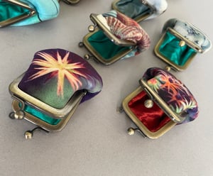 Topped with a sweet antiqued brass kisslock frame with loop for optionally adding chain or keyring.